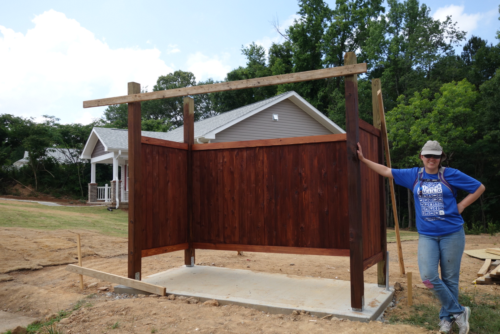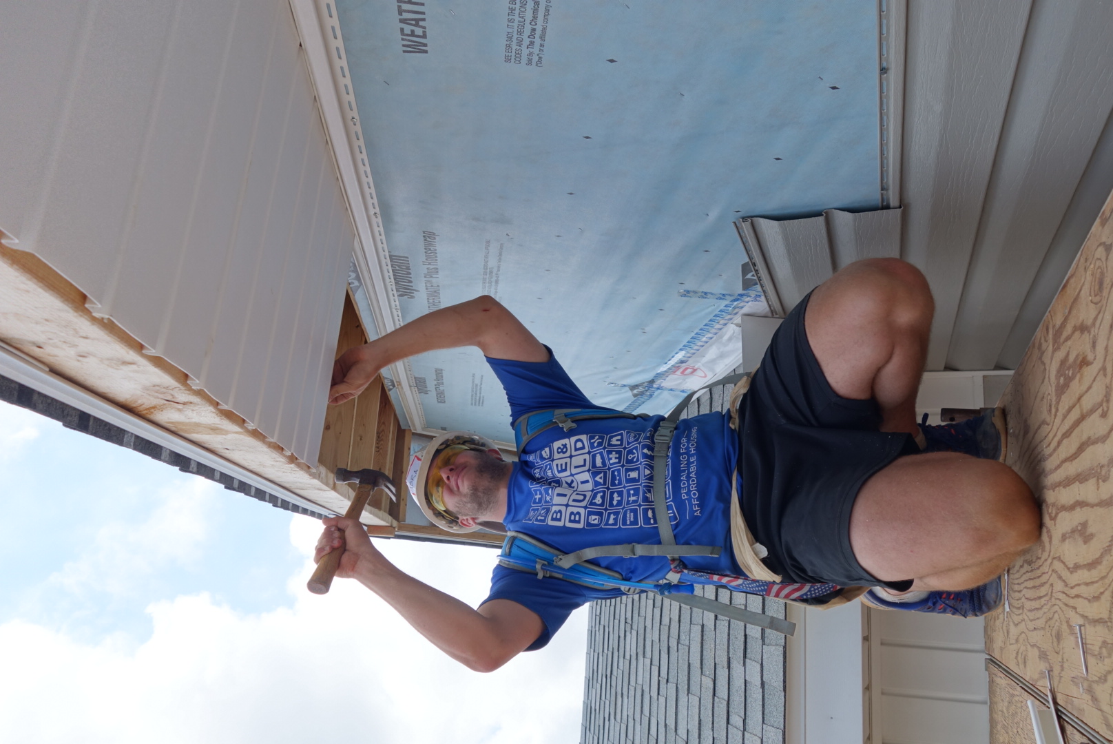 I worked on siding the top of a houses front wall. Others installed subfloors or painted. Helen made a bus stop.